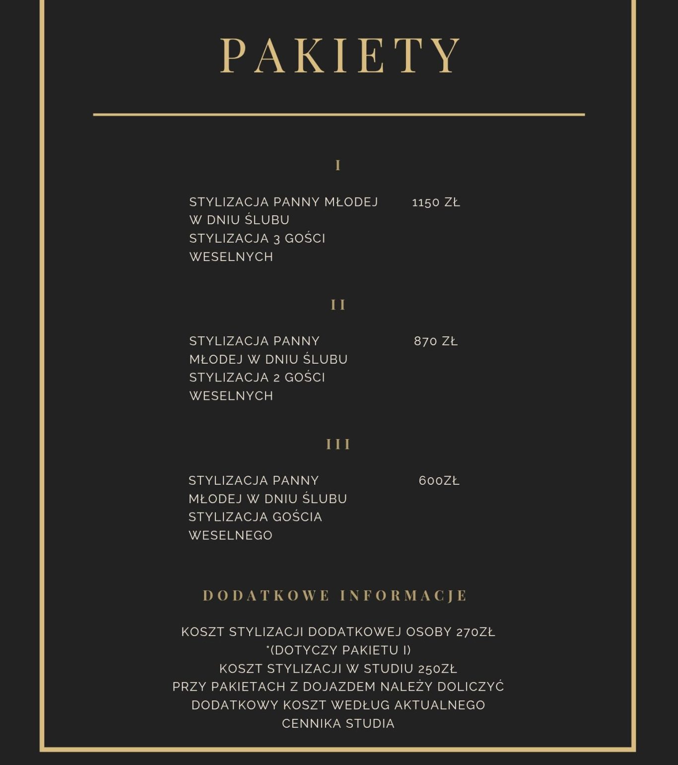 Pakiet obejmuje wykonanie stylizacji w dniu uroczystości wraz z ewentualnymi poprawkami oraz możliwość skorzystania z usługi mobilnej. Próba stylizacji jest dostępna jako opcja dodatkowa - nie jest obowiązkowa, ale dla wielu osób stanowi komfortowe rozwiązanie.